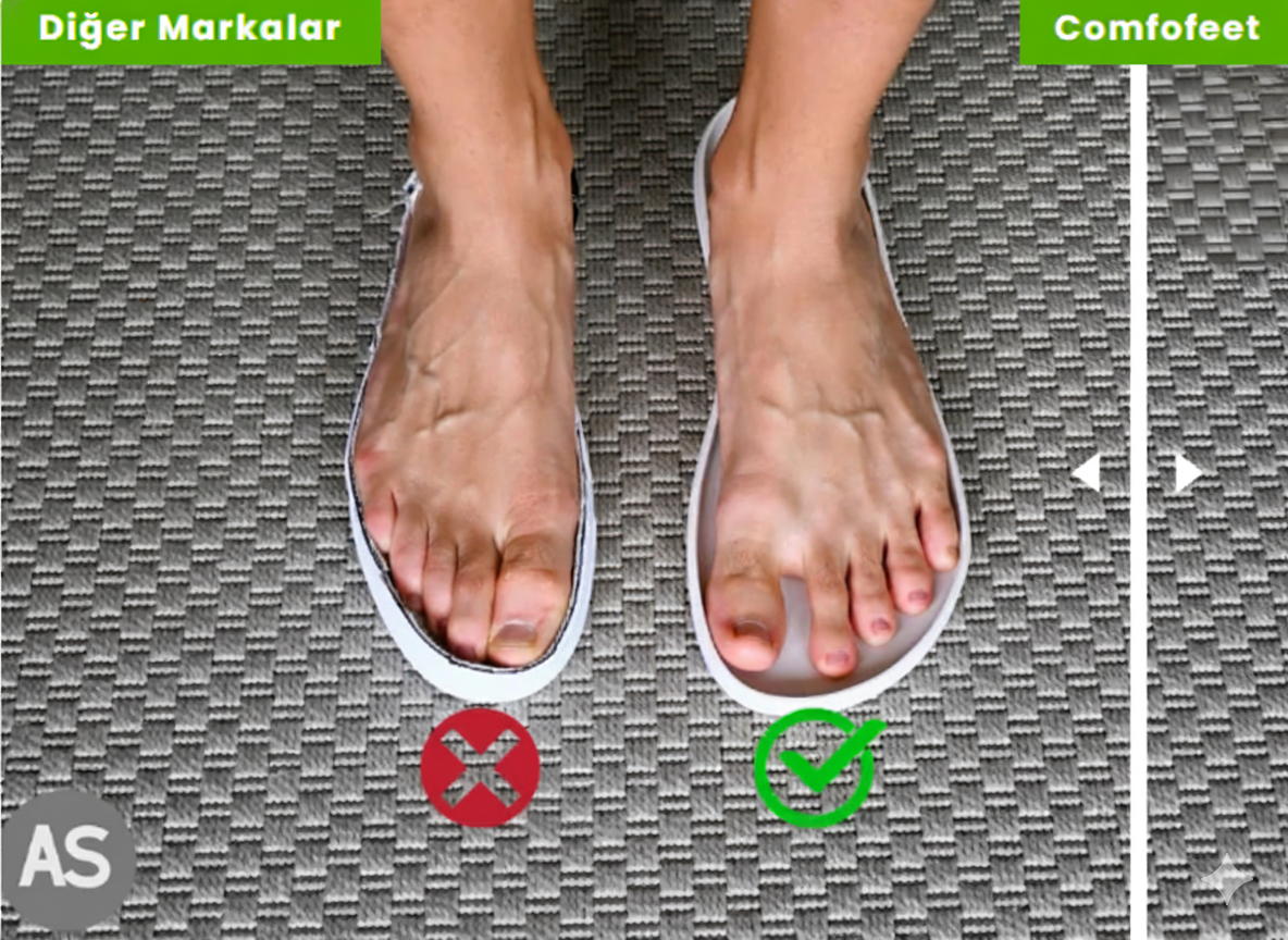 Diğer markaların dar kalıpları ayak parmaklarını sıkıştırırken, Comfo Feet’in anatomik uyumlu yapısı ayaklarınızın rahatça açılmasına, dengeli durmasına ve gün boyu konforlu hissetmesine yardımcı olur.