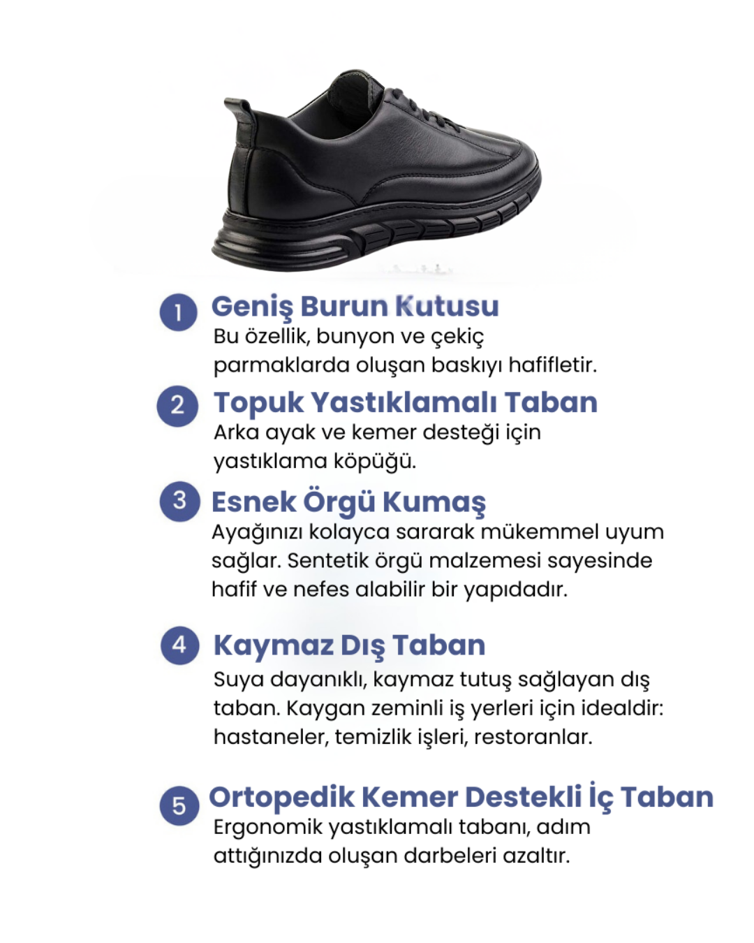 Ayak ön kısmında sıkışma ve baskıdan kaynaklanan ağrılar, ortopedik ayakkabımız sayesinde geniş burun yapısı ile azaltılır; bu sayede ağrı ve rahatsızlık hissinin hafiflemesine yardımcı olunur.
