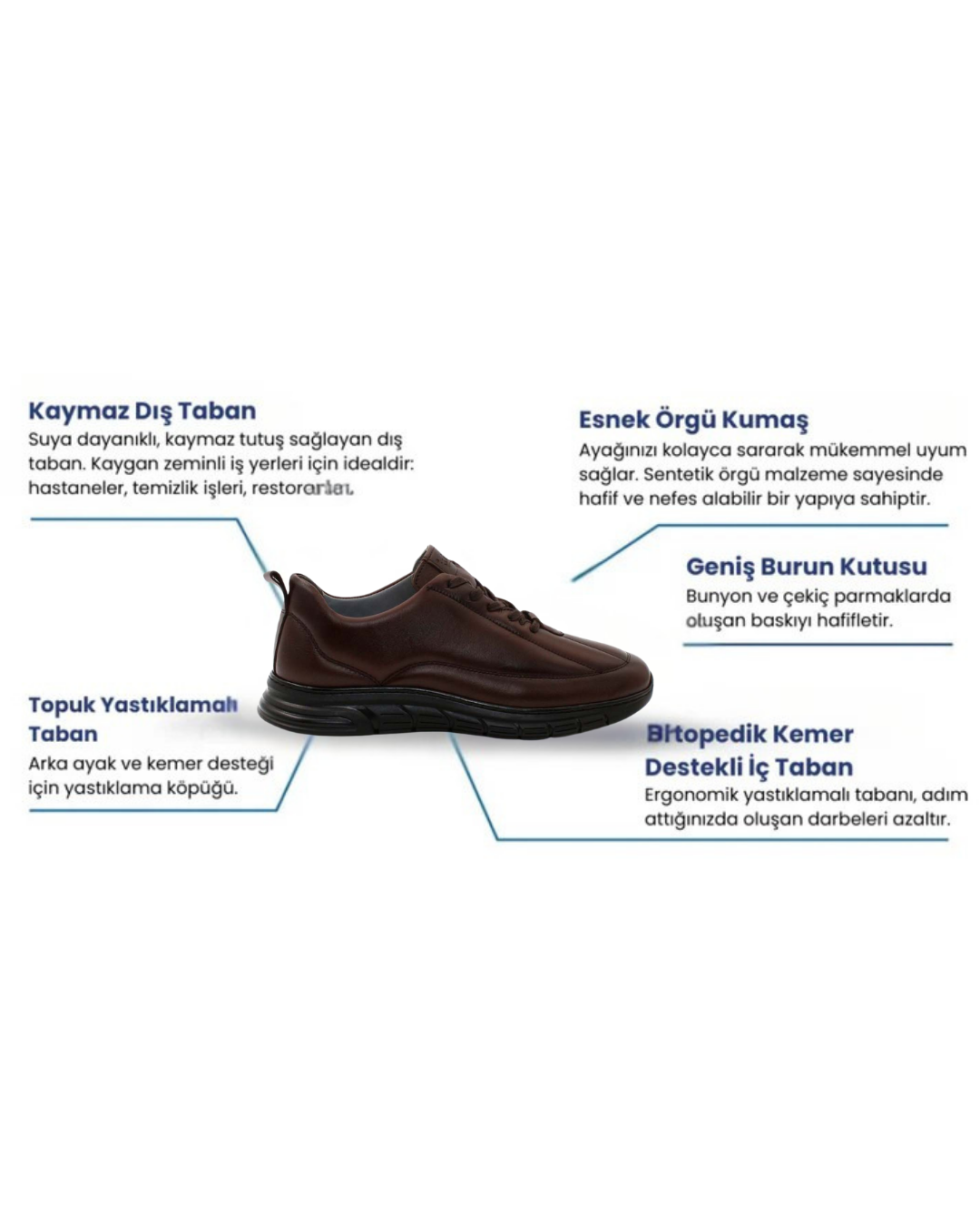 Ayak ön kısmında sıkışma ve baskıdan kaynaklanan ağrılar, ortopedik ayakkabımız sayesinde geniş burun yapısı ile azaltılır; bu sayede ağrı ve rahatsızlık hissinin hafiflemesine yardımcı olunur.
