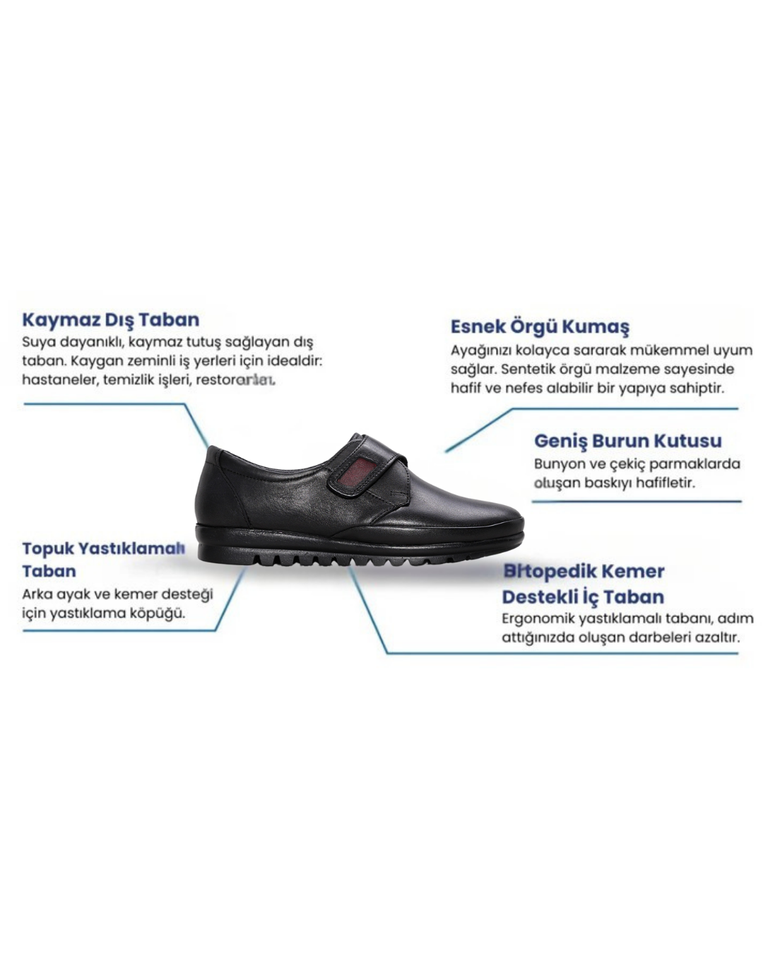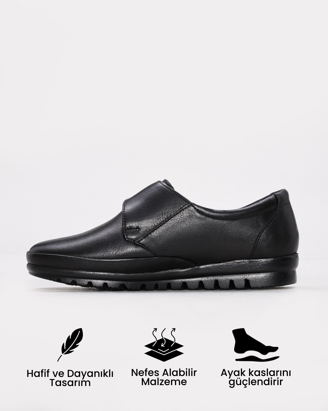 Ayak anatomisine uygun iç tabanı ile gün boyu ağrısız ve konforlu yürüyüş sağlar.