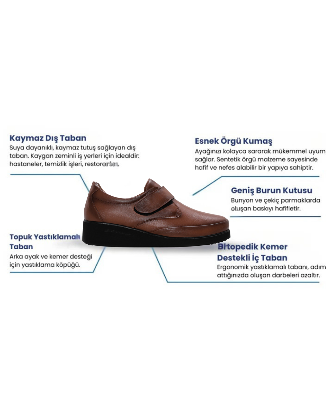 Ayak ön kısmında sıkışma ve baskıdan kaynaklanan ağrılar, ortopedik ayakkabımız sayesinde geniş burun yapısı ile azaltılır; bu sayede ağrı ve rahatsızlık hissinin hafiflemesine yardımcı olunur.