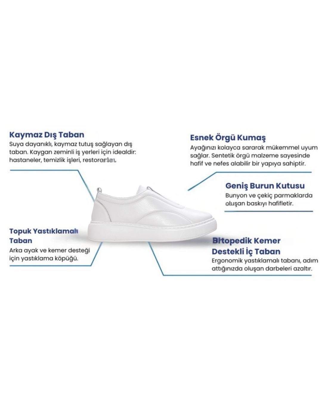 Esnek yapısı, hafifliği ve ergonomik taban teknolojisi sayesinde Comfo Feet, gün boyu konforu hissettirirken ayak sağlığınızı da destekler.